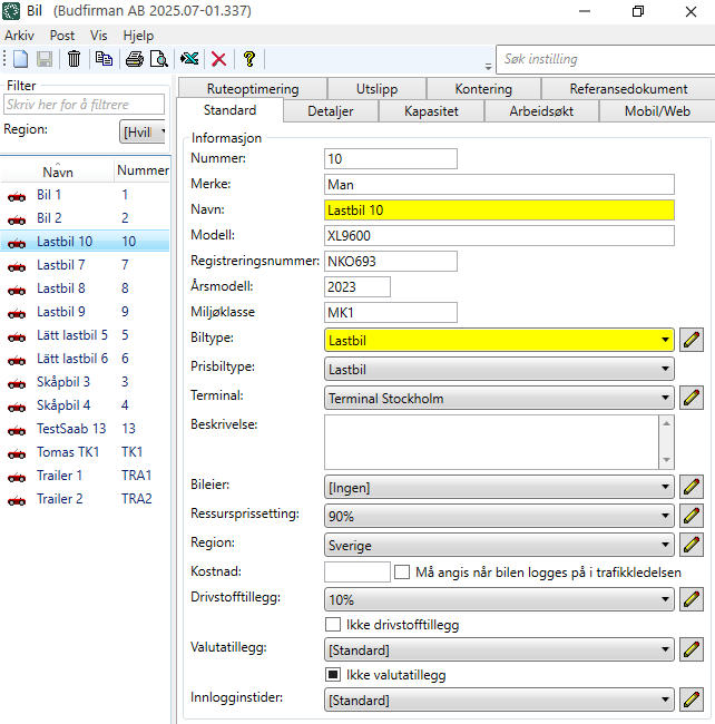 Hvis verdien i feltet vises i kursiv, betyr det at verdien kommer fra kjøretøytypen (som du har valgt i nedtrekkslisten Biltype på fanen Standard). Hvis du ønsker det, kan du legge inn andre verdier for bilen her i kjøretøyregisteret. Opter henter informasjon om kapasitet først fra bilen og deretter fra kjøretøytypen.