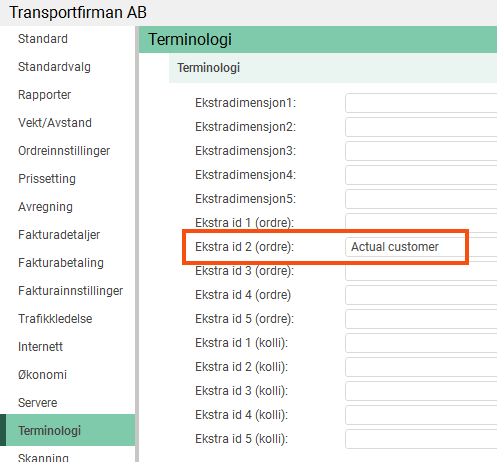 Gå til fanen Terminologi i kontorinnstillingene og skriv inn det navnet du ønsker å gi kundefeltet for et av feltene Ekstra id 1 (ordre)–Ekstra id 5 (ordre). I vårt tilfelle «Faktisk kunde».