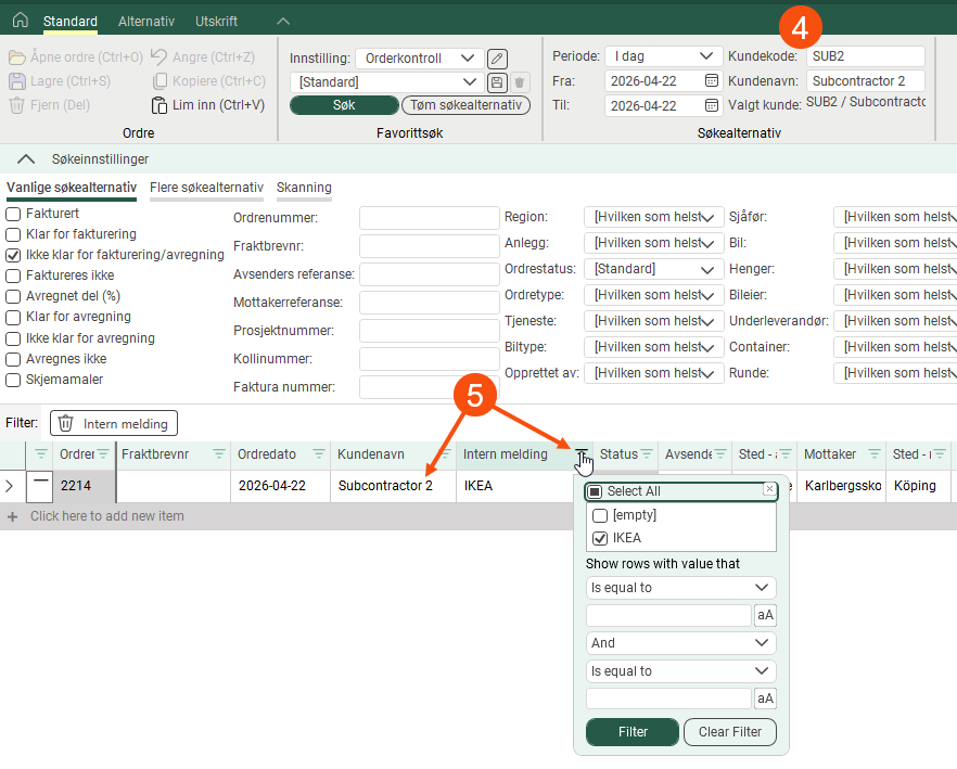 Åpne ordrekontrollen og sørg for at en av kolonnene Intern melding og Ekstern melding vises i ordrelisten (se Ordrekontrollen). Finn deretter frem alle ordrene fra kunden «Subcontractor 2».