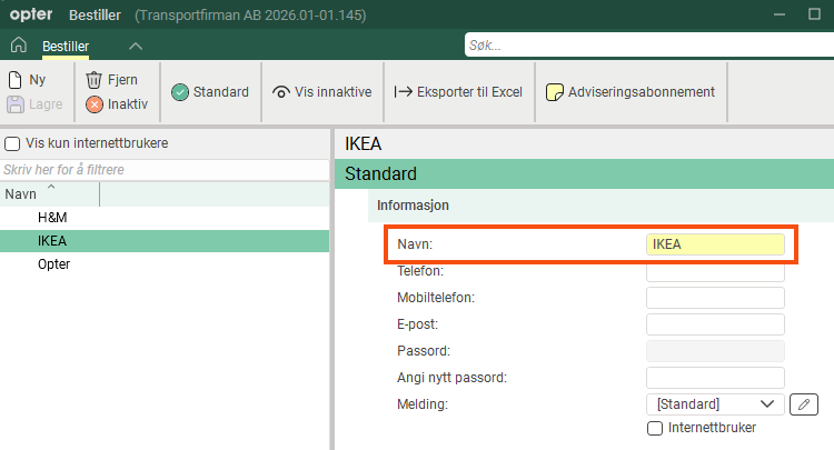 Legg også til Bestiller på fanen Kolonner i listene og felt i detaljvisningen i internettordreinnstillingene, slik at underleverandøren kan se hvem kunden er på eksisterende bestillinger.