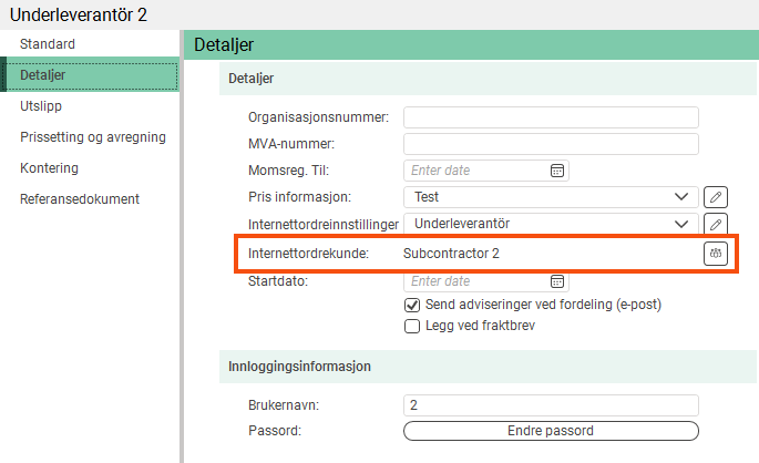 Legg til en kunde i kunderegisteret som kun brukes til nettbestillinger fra én og samme underleverandør (for eksempel «Underleverandør 2»). Kombiner dette med at underleverandøren oppgir den riktige kunden i et fritekstfelt, et ekstra ID-felt eller som bestiller. Du kan deretter finne ordrene i ordrekontrollen og tilordne dem til riktig kunde.