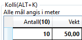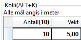 Velg dette alternativet hvis du ønsker å kunne skrive inn for eksempel "10 pakker à 5 kg" på en linje i seksjonen Kolli og ønsker at vektberegningen skal summere seg til 10 x 5 kg = 50 kg.