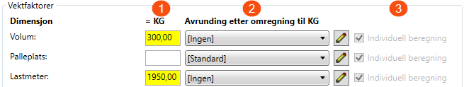 : Dimensjonen beregnes individuelt. Avkrysningsboksen er automatisk valgt (og kan ikke endres) for dimensjonene Volum, Palleplats og Lastmeter, ettersom disse dimensjonene alltid beregnes individuelt.