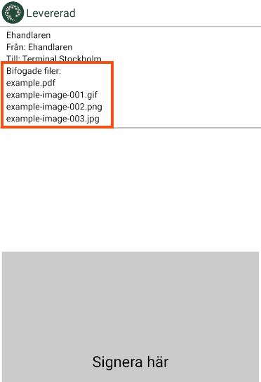 Du kan ställa in att föraren ska kunna visa och ladda ner filer som har bifogats en order. JPG- och PNG-filer kan öppnas direkt i Opter Driver, eller laddas ner till mobilen. BMP-, GIF-, TIF- och PDF-filer kan laddas ner och sedan öppnas i en annan app som kan hantera de formaten.