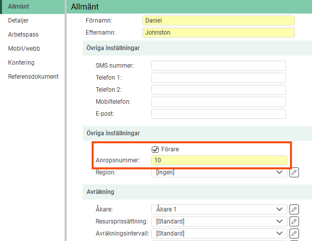 Markera en anställd i listan till vänster och markera sedan Förare på fliken Allmänt. Du måste även ange ett anropsnummer för föraren. Om föraren inte finns som anställd lägger du till den genom att klicka på Ny.