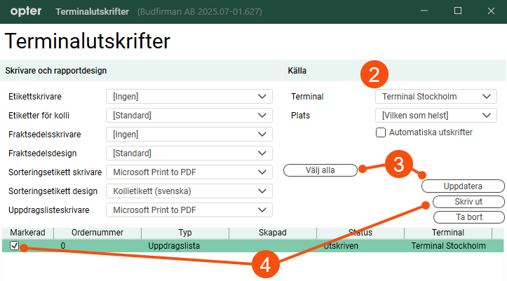 När förarna avgångsskannar på terminal kan de skicka en begäran till Opter om att skriva ut uppdragslistan när de är klara. Uppdragslistan skrivs ut från fönstret Terminalutskrifter i Opter.