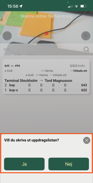 Föraren skannar kollina som vanligt. När det är klart visas en fråga om uppdragslistan ska skrivas ut. Om föraren svarar Ja skrivs inte listan ut direkt utan skickas till Opter, där den kan skrivas ut som PDF eller på papper.