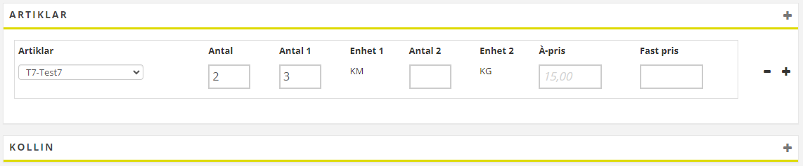 Antal 1 och Antal 2 under Artiklar. Fungerar tillsammans med À-pris (artikel). À-priset multipliceras med antalet av enheten. Den summan multipliceras i sin tur med antalet av artikeln (Antal). Artiklar måste inkluderas, annars visas inte det här fältet eftersom det ligger under den sektionen. |