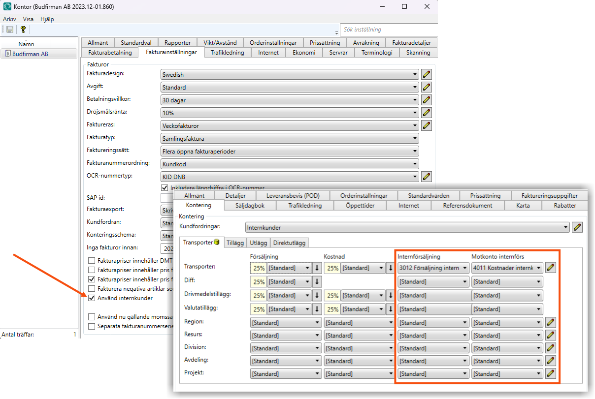 Avdelningen eller bolaget som ni vill internfakturera måste finnas som kund i kundregistret och vara inställd som internkund.