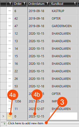 Det går även bra att klicka på det fält som ligger längst till vänster av de fält du har kopierat från Excel-filen, till exempel Orderdatum (4b), och sedan klistra in de nya ordrarna med Ctrl + V.