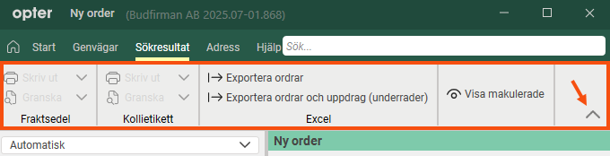 Om du tycker att menyområdet (ribbon-menyn) tar för stor plats i fönstret med ordermottagningen, så kan du göra riddon-menyn mindre (steg 1) eller stänga riddon-menyn (steg 2) genom att göra något av följande: