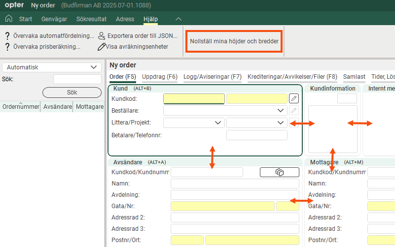 Användare som har gjort egna storleksjusteringar kommer att ha kvar dem, men om de trycker på knappen Nollställ mina höjder och bredder (i ordermottagningen under Hjälp) så kommer dina nuvarande storleksjusteringar vara de som gäller. (Om de därefter gör egna justeringar så kommer Opter automatiskt att spara deras justeringar per orderinställning, användare och dator.)