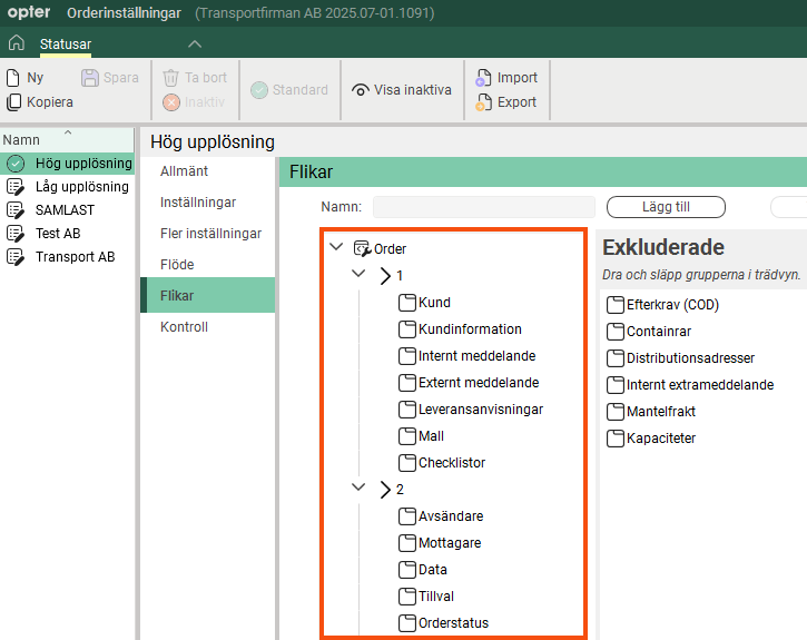 Du kan även välja vilka fält, listrutor och kryssrutor som ska vara synliga, viktiga stopp, obligatoriska (tvingande) att fylla i och vilka som ska visas i versaler. Instruktioner finns i Fält och kryssrutor i ordermottagningen och Orderinställningar (fönster).