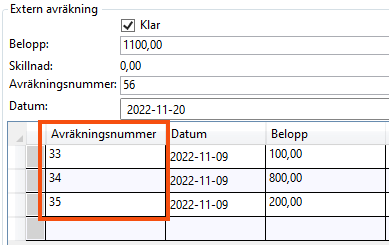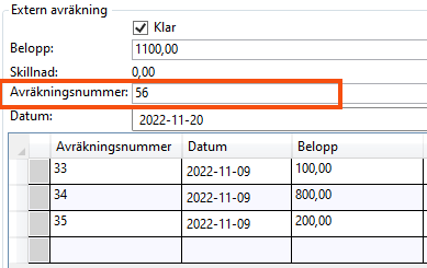 Om den externa avräkningen är importerad visas det nummer som avräkningen har hos din samarbetspartner. Om du manuellt har lagt till den externa avräkningen i ordermottagningen visas det avräkningsnummer du angav, om du angav något nummer.