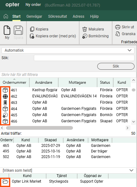 Längst till vänster i ordermottagningen kan ikoner visas så att du snabbt ser vilka ordrar som är internetordrar, samlastningsordrar, bomkörningar, och vilka ordrar som för tillfället är öppna hos någon annan till exempel. Bilden visar hur det kan se ut i ordermottagningen i nya designen. (Opter i ny design finns tillgängligt från och med 2025.12.00 och 2025.07.831+.)