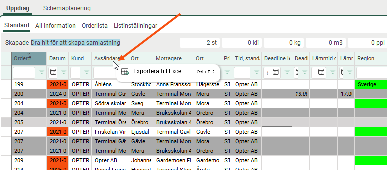 Nu kan de flesta register och listor exporteras till Excel, till exempel uppdrag i trafikledningen och tariffer. I registren finns alternativet på menyn som tidigare. I listor högerklickar du och väljer Exportera till Excel.
