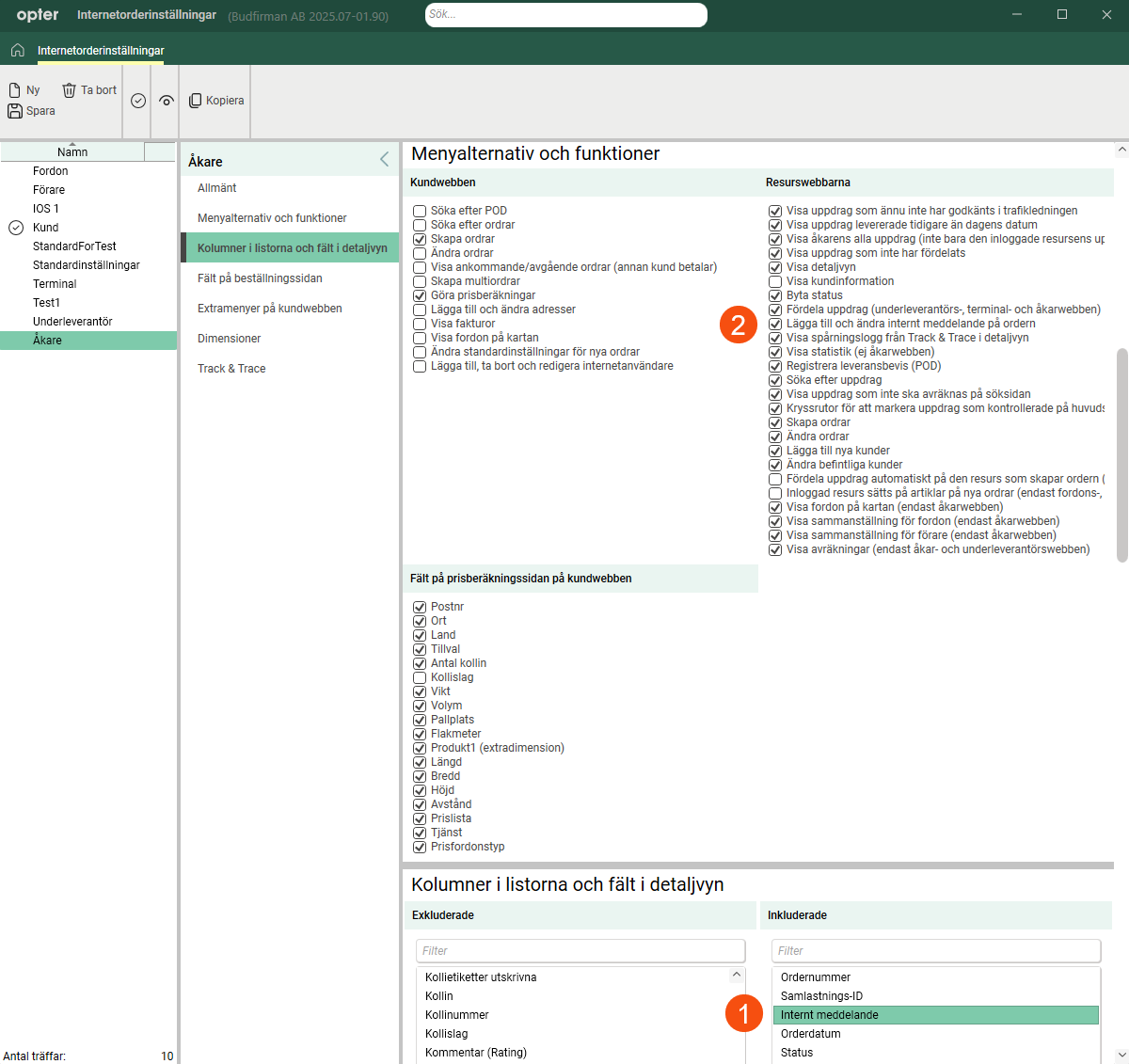 Inställningen har delats upp så att det går att visa kolumnen Internt meddelande på åkar- och underleverantörswebben utan att användarna kan redigera eller lägga till meddelanden.
