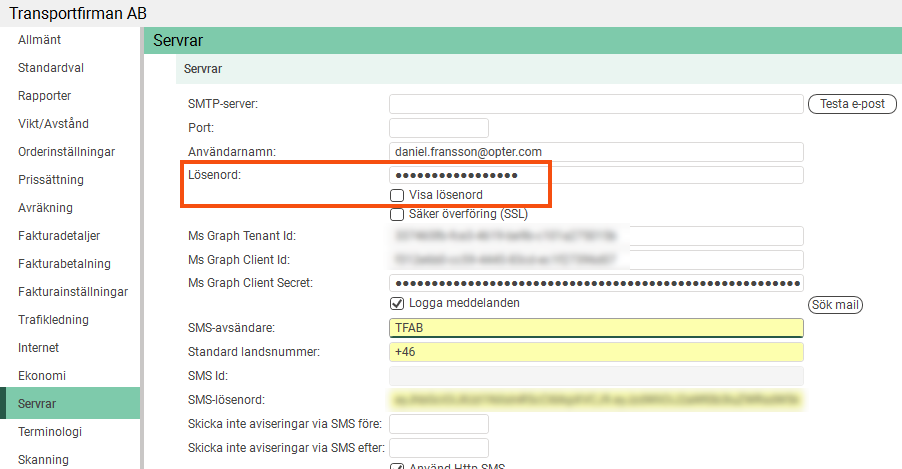 Lösenordet till SMTP-servern på fliken Servrar i kontorsinställningarna är nu dolt, men det går att visa med en kryssruta. Detsamma gäller lösenorden för EDI-transporter.