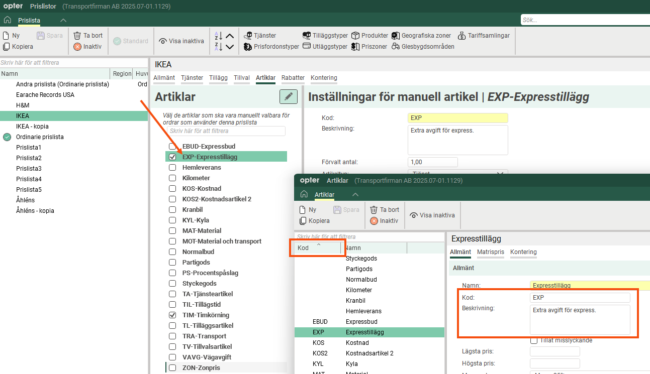 Det går nu att ange kod och beskrivning för artiklar direkt i artikelregistret, där det också går att sortera på artikelkoden. På fliken Artiklar i prislistan visas nu också koden i namnet på artikeln.