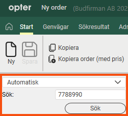 Välj Automatisk och skriv in ordernummer, fakturanummer, fraktsedelsnummer, kollinummer, avsändarreferens, mottagarreferens eller extra-ID 1–extra-ID 5 i sökfältet. Tryck på Sök eller Enter. Opter söker då bland ordrar med orderdatum de senaste tre månaderna.