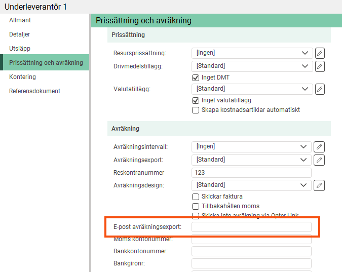 Det går nu att skicka avräkningar till en annan e-postadress än den som aviseringarna skickas till. Ange adressen i fältet E-post avräkningsexport på fliken Prissättning och avräkning i underleverantörsregistret. Aviseringarna skickas fortfarande till den adress som står under Kontaktinformation på fliken Allmänt.