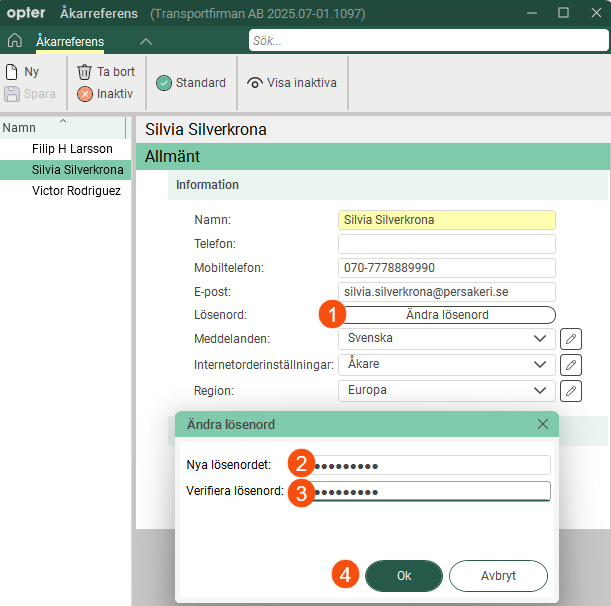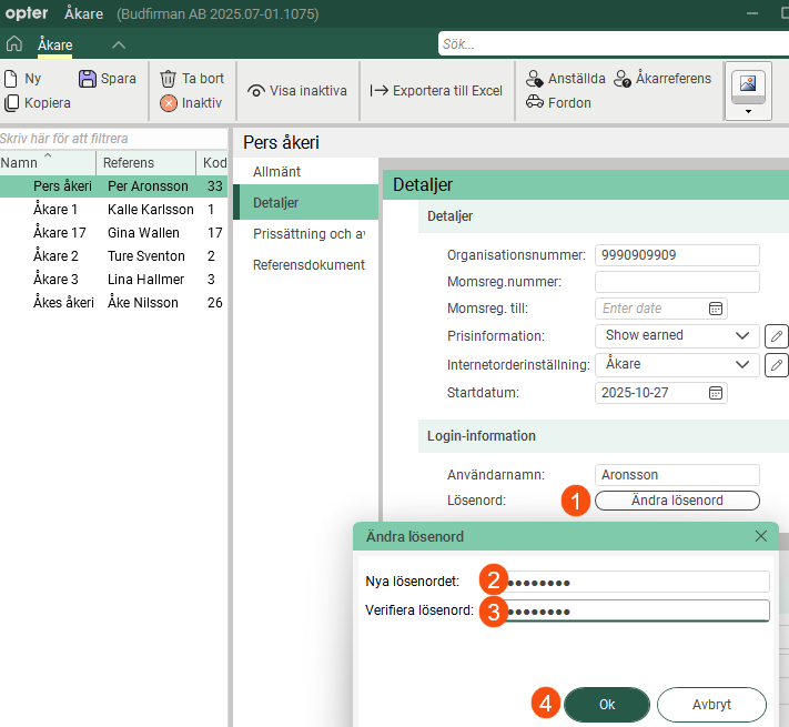 Lösenorden för underleverantörer, åkare och åkarreferenser visas inte längre i registren. Om någon har glömt sitt lösenord skapar ni enkelt ett nytt genom att klicka på Ändra lösenord på fliken Detaljer. Skriv in det nya lösenordet i fälten Nya lösenordet och Verifiera lösenord och klicka sedan på Ok.
