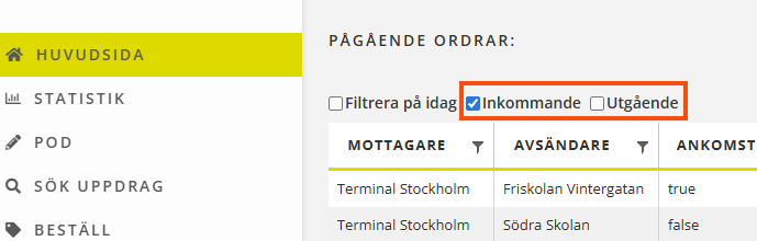 På terminalwebben går det nu att filtrera listan på huvudsidan på Inkommande och Utgående ordrar.