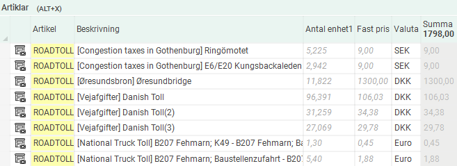 I ordermottagningen och på fakturor och avräkningar visas då till exempel avståndsbaserade vägavgifter individuellt med en artikelrad per sträcka, och broavgifter visas individuellt med en artikelrad per broavgift.