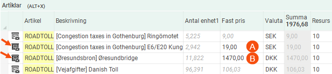 Bilderna ovan visar hur ikonen för vägavgiftsartiklar ser ut, och att ikonen på artikelraden byter utseeende om du ändrar beloppet i kolumnen Fast pris, antalet km i kolumnen Antal enhet1 eller resurs i kolumnen Resurs. Om beloppet eller antalet km har angetts manuellt visas siffrorna i normal svart text, se (A) och (B) i bilderna ovan.