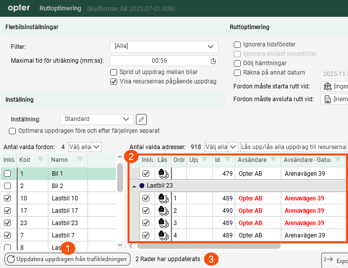 Om ni arbetar i trafikledningen samtidigt som ni arbetar i fönstret Ruttoptimering så kan knappen Uppdatera uppdragen från trafikledningen (1) vara användbar. När du trycker på knappen (eller F5) så uppdateras hela adresslistan (2) i fönstret Ruttoptimering från trafikledningen. (All information om uppdragen uppdateras, men inga nya uppdrag tillkommer eller tas bort.) Bredvid knappen visas hur många rader som har uppdaterats (3). Glöm inte att beräkna körordningen igen om adresslistan har uppdaterats.