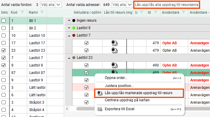 Om du vill låsa upp eller låsa flera (men inte alla) uppdrag, markera uppdragen i adresslistan, högerklicka och välj sedan Lås upp/lås markerade uppdrag till resurs.