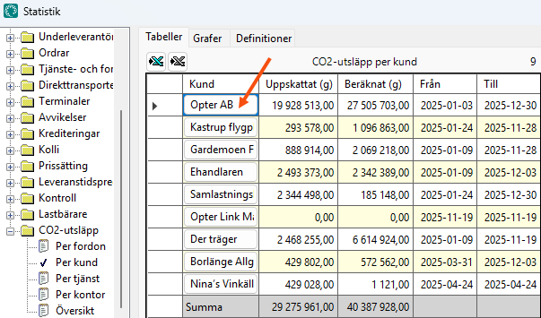 Till exempel, om du valde Per kund, så visas det uppskattade och det beräknade CO2-utsläppet för varje kund under perioden du valt.