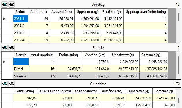 Statistikrapporten baseras på schabloner. För att få den så korrekt som möjligt behöver du ta reda på era verkliga CO2-utsläpp, till exempel genom att summera allt som tankas under en tidsperiod. Prova dig sedan fram med olika faktorer på tjänster tills summan i statistiken stämmer med verkligheten och fördelningen mellan olika uppdrag är rimlig.