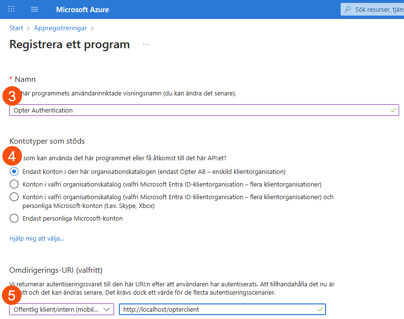 Välj Offentlig klient/intern (mobil och dator) under Omdirigerings-URI (valfritt) och skriv ”http://localhost/opterclient” i fältet till höger.