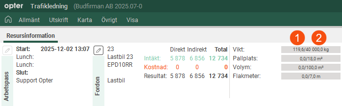 Standarddimensionerna och eventuella extradimensioner visas i rutan Resursinformation i trafikledningen. Vid (2) i bilden nedan visas det värdet som du har skrivit in i till exempel fältet Vikt på fliken Kapacitet i fordonsregistret eller, i andra hand, värdet i till exempel fältet Vikt på fliken Kapacitet i registret för fordonstyper.